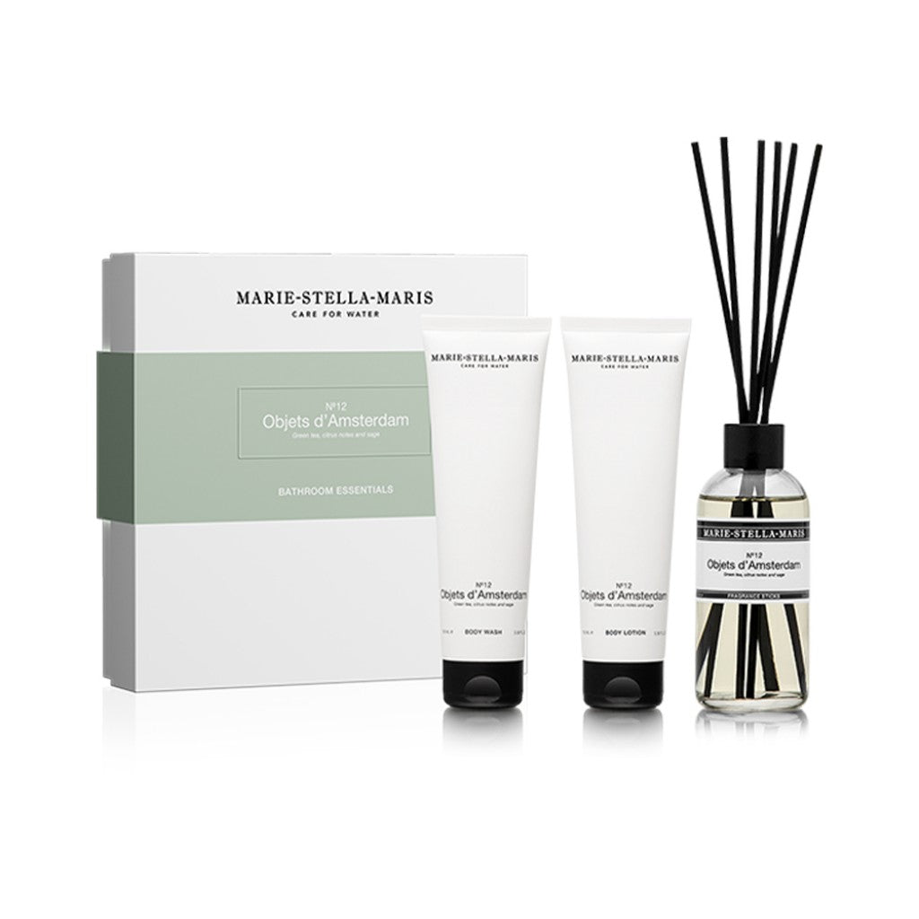 Ervaar luxe verzorging in je badkamer met onze Bathroom Essentials. De set bestaat uit geurstokjes, een bodywash en een bodylotion in onze iconische en sprankelende geur No.12 Objets d’Amsterdam. De bodywash en bodylotion zijn geformuleerd met 96% natuurlijke ingrediënten die de huid zacht reinigen en intens hydrateren. De geurstokjes creëren een verfijnde geurbeleving met sprankelende tonen van groene thee, citrus en salie.